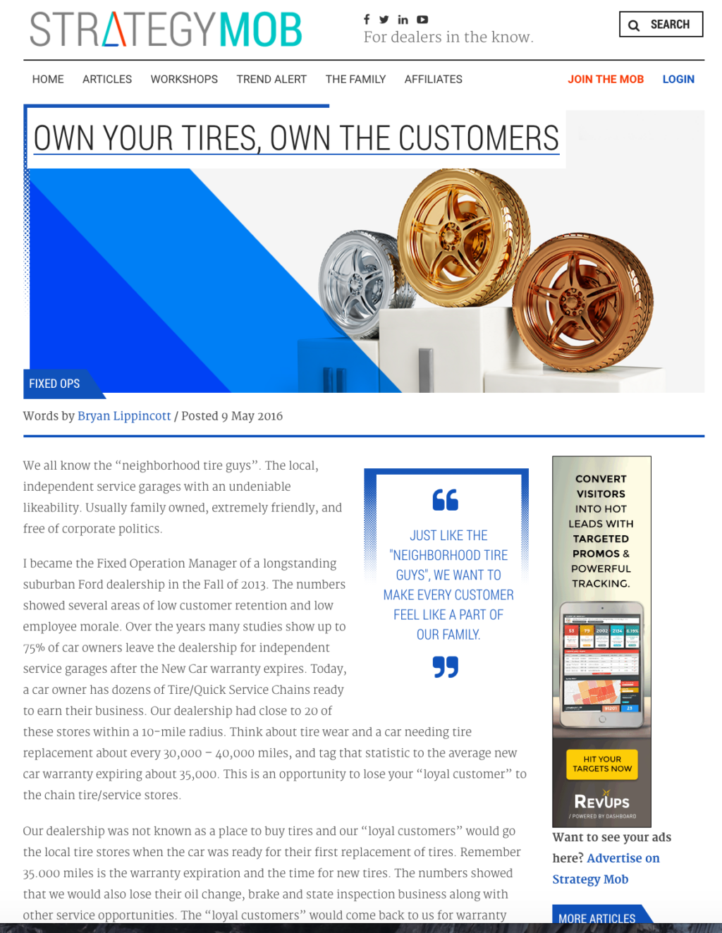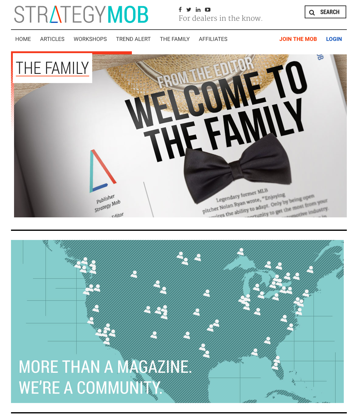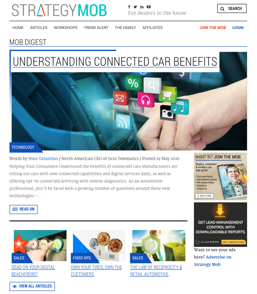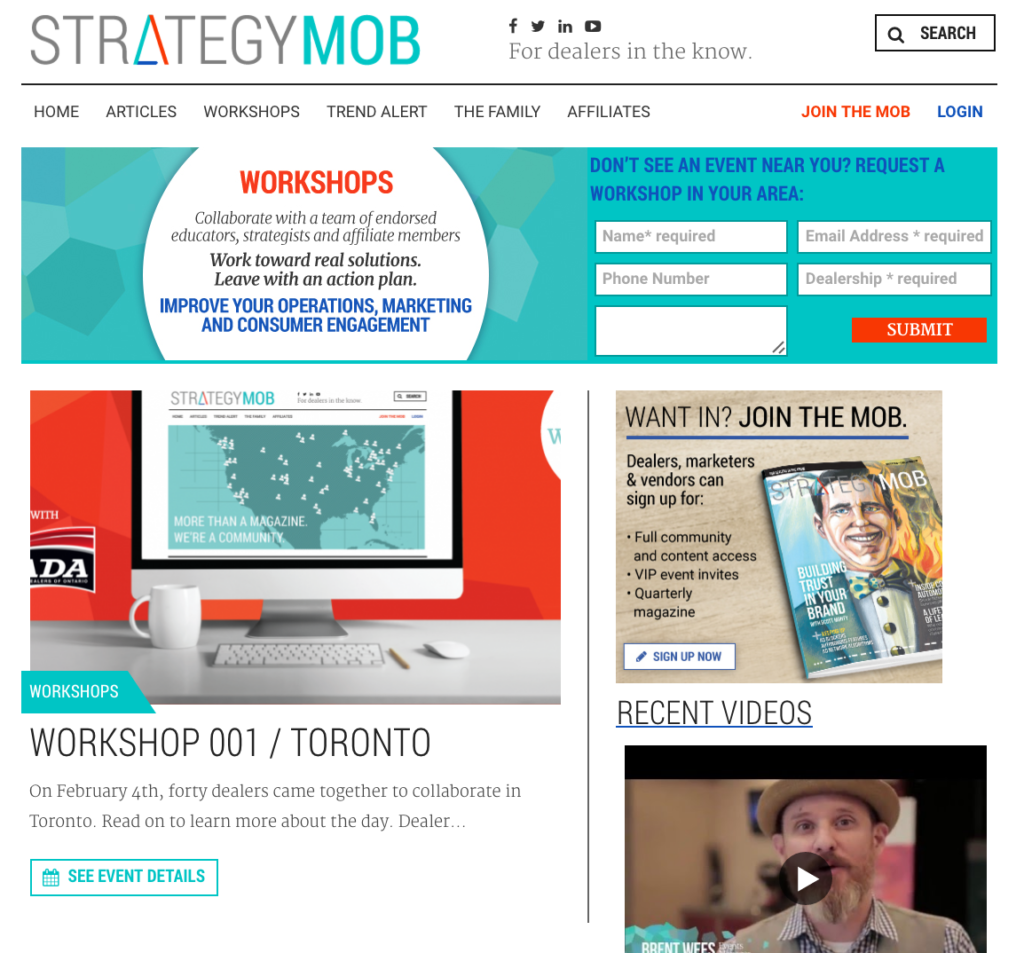 The main aspects of the program include a quarterly high-quality printed magazine sent out to dealerships, dealer groups, industry gurus and OEM executives throughout North America as well as a companion community website strategymob.com. Strategy Mob Magazine allows for a wealth of content for readers to help improve their day to day operations as a dealership from some of the brightest minds in automotive. Automotive dealers and vendors are invited to become part of Strategy Mob’s website community at strategymob.com. The site features videos, product reviews and solutions, plus the ability to sign up/join to submit articles on automotive industry topics.