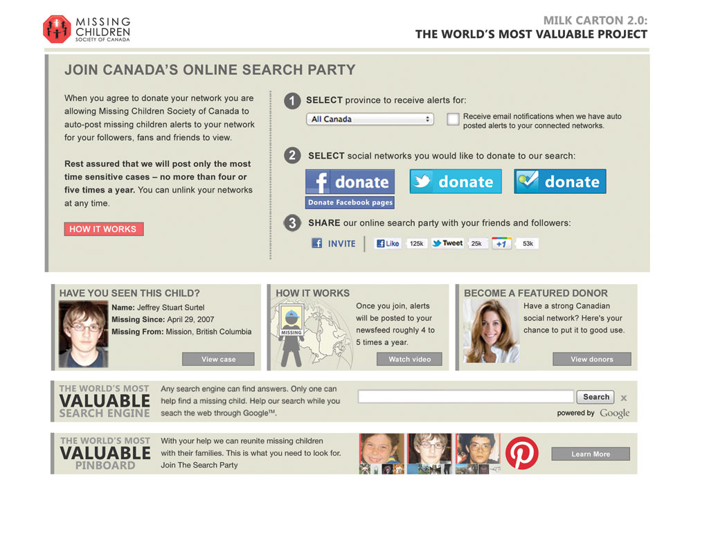 Instead of an ad campaign we created Milk Carton 2.0: The World’s Most Valuable Social Network – a series of web and mobile innovations on social platforms that created a new media channel for sharing missing child alerts and involving the public in the search.